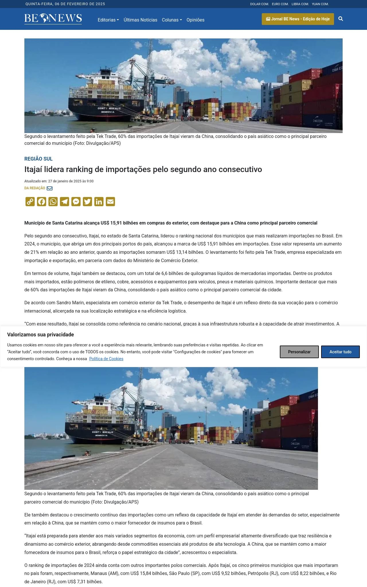 Itajaí lidera ranking de importações pelo segundo ano consecutivo