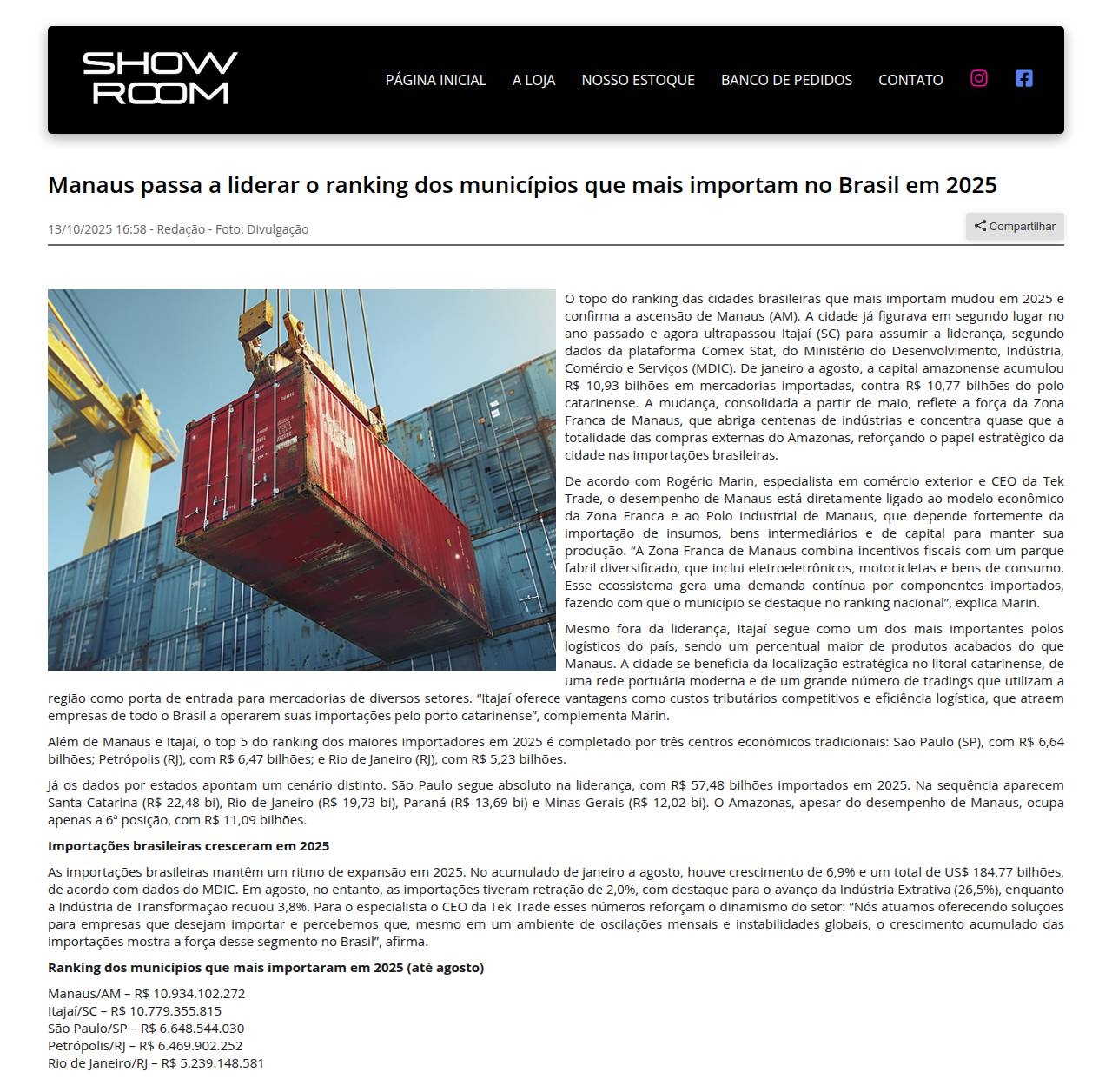 Manaus passa a liderar o ranking dos municípios que mais importam no Brasil em 2025