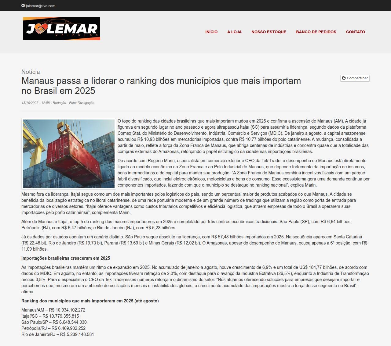 Notícia Manaus passa a liderar o ranking dos municípios que mais importam no Brasil em 2025 13/10/2025 - 12:58 - Redação -