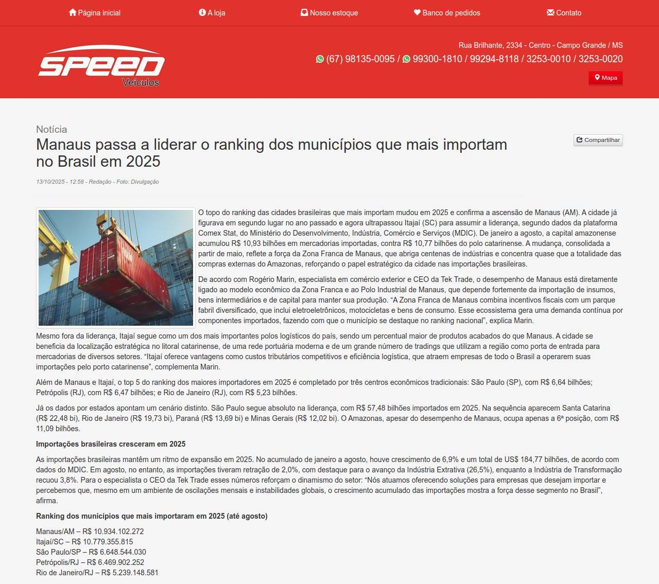 Notícia Manaus passa a liderar o ranking dos municípios que mais importam no Brasil em 2025 13/10/2025 - 12:58 - Redação -