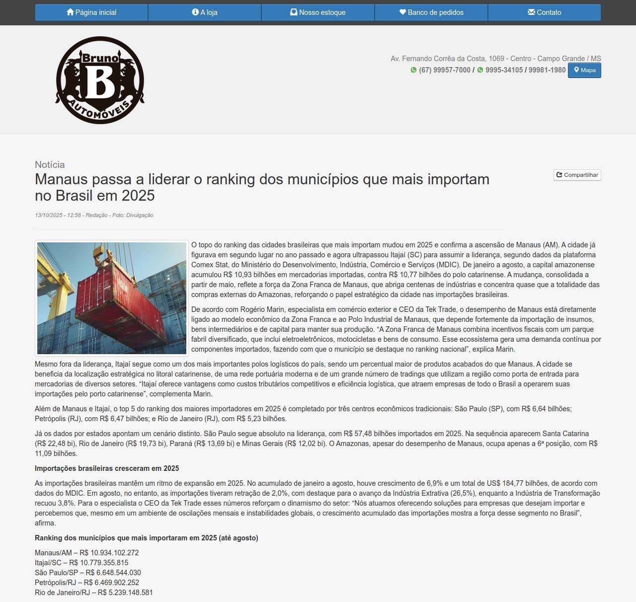 Notícia Manaus passa a liderar o ranking dos municípios que mais importam no Brasil em 2025 13/10/2025 - 12:58 - Redação -