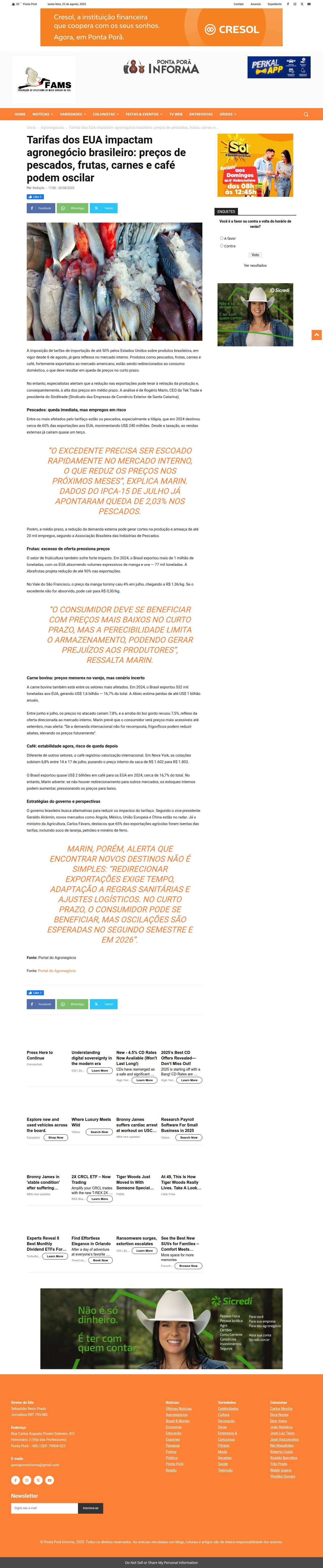 https://www.pontaporainforma.com.br/tarifas-dos-eua-impactam-agronegocio-brasileiro-precos-de-pescados-frutas-carnes-e-cafe-podem-oscilar